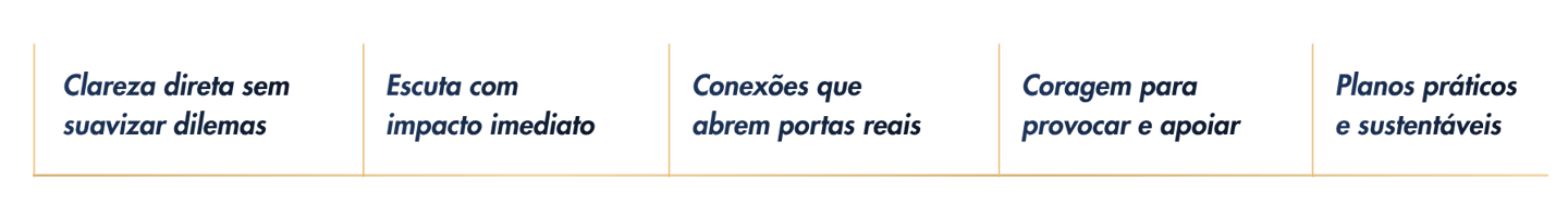 Com trajetória entre o mundo corporativo global, com trajetória entre o mundo corporativo e as mentorias, individual, em grupo, e a mentoria executiva, desenvolvi um método que une clareza, coragem e conexão para destravar decisões críticas de carreira.